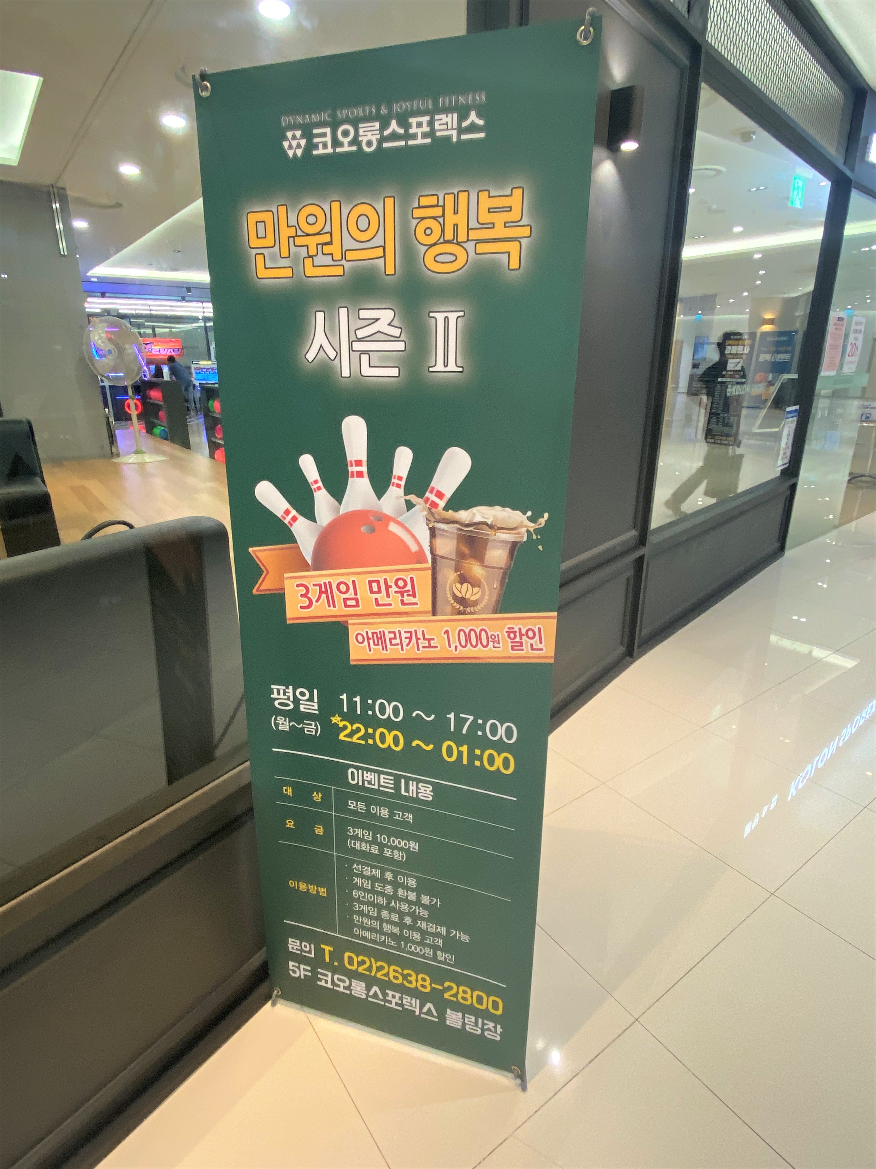 친한 지인분과 뭐 하면서 재미있는 시간을 보낼까 고민하던 중 볼링 하러 가자고 추천하셔서 같이 볼링을 치러 왔습니다. 타임스퀘어 건물에 5층에 올라가시면 코오롱스포렉스라고 볼링&펍이 있어요~