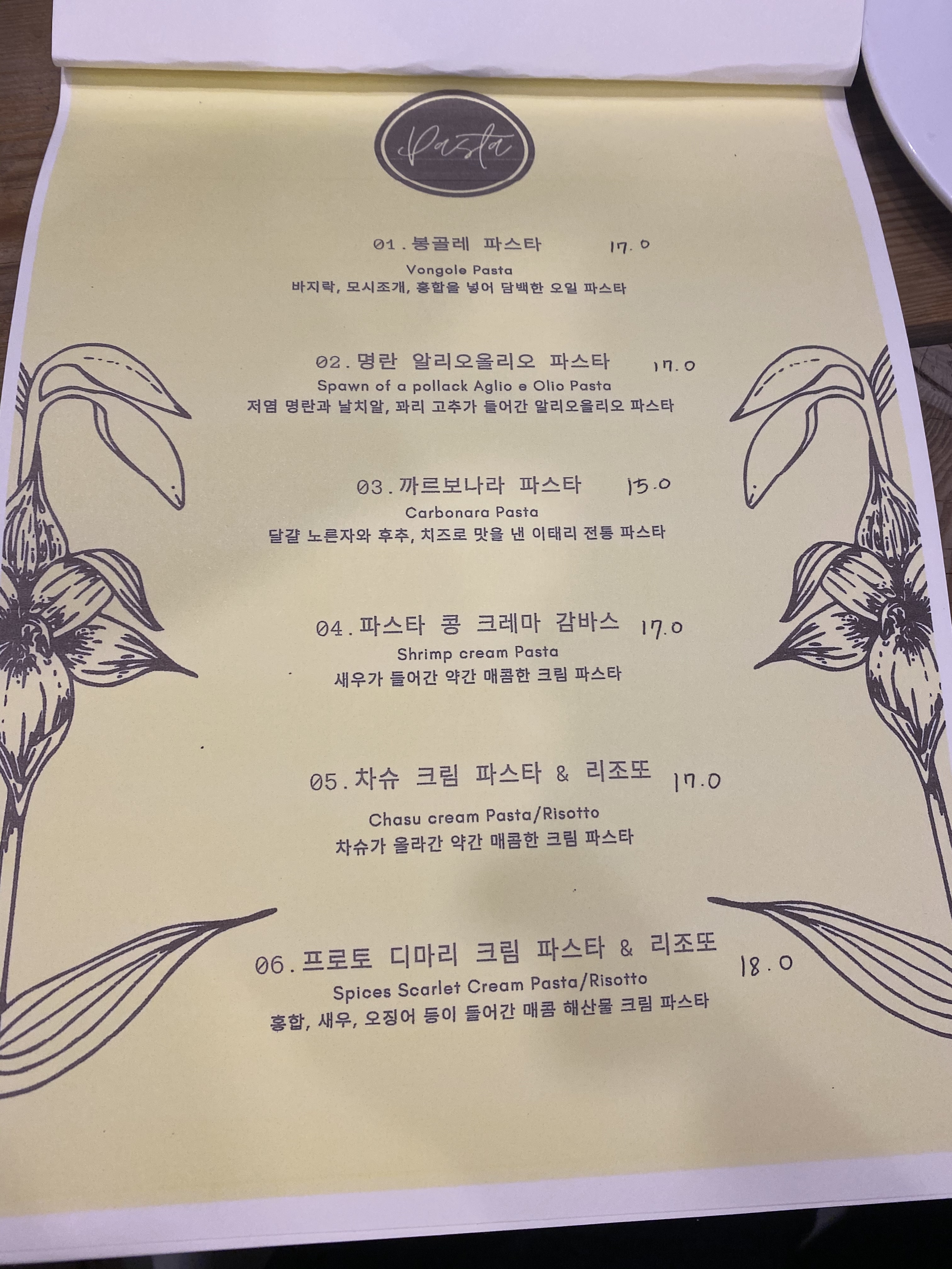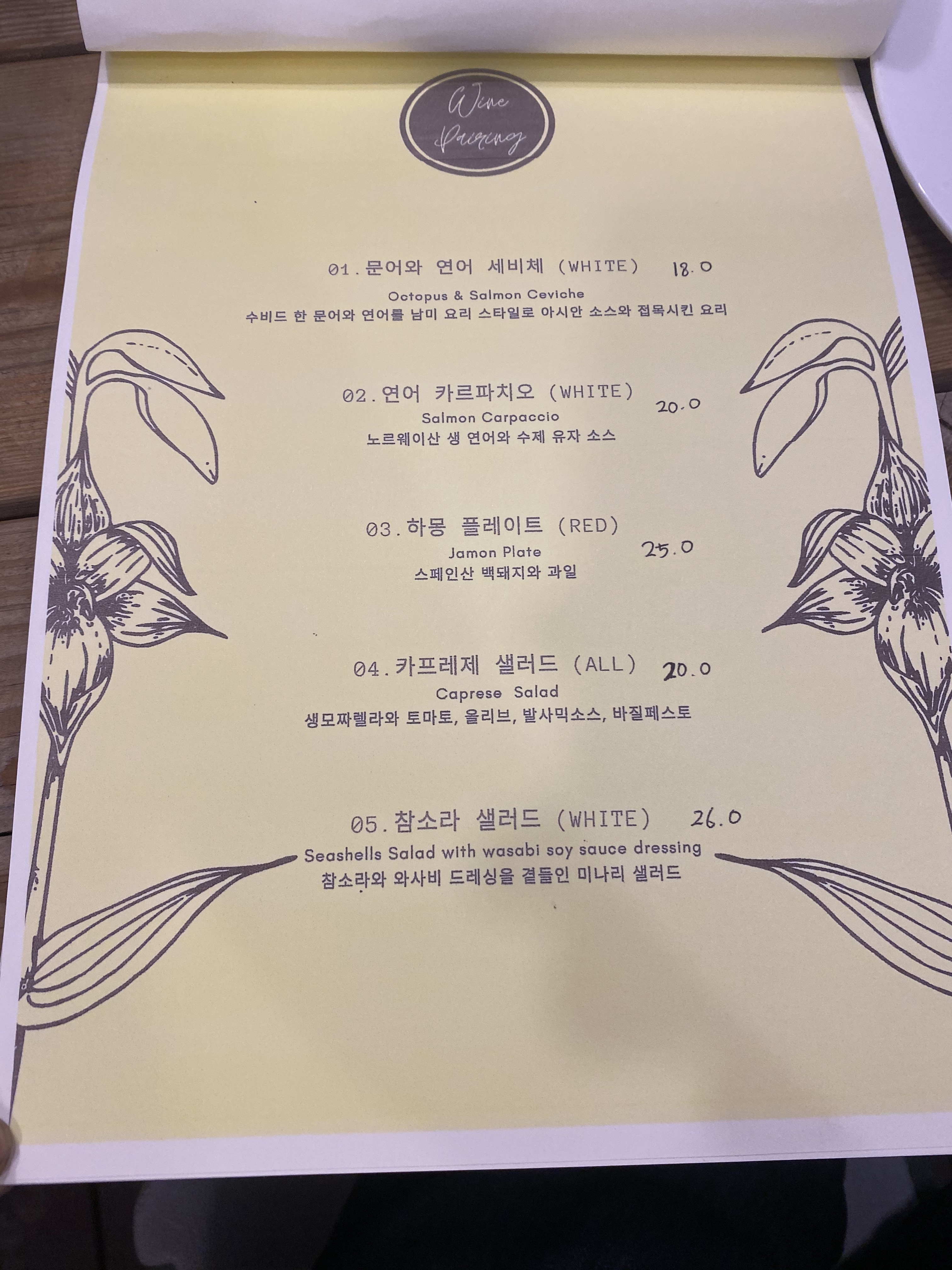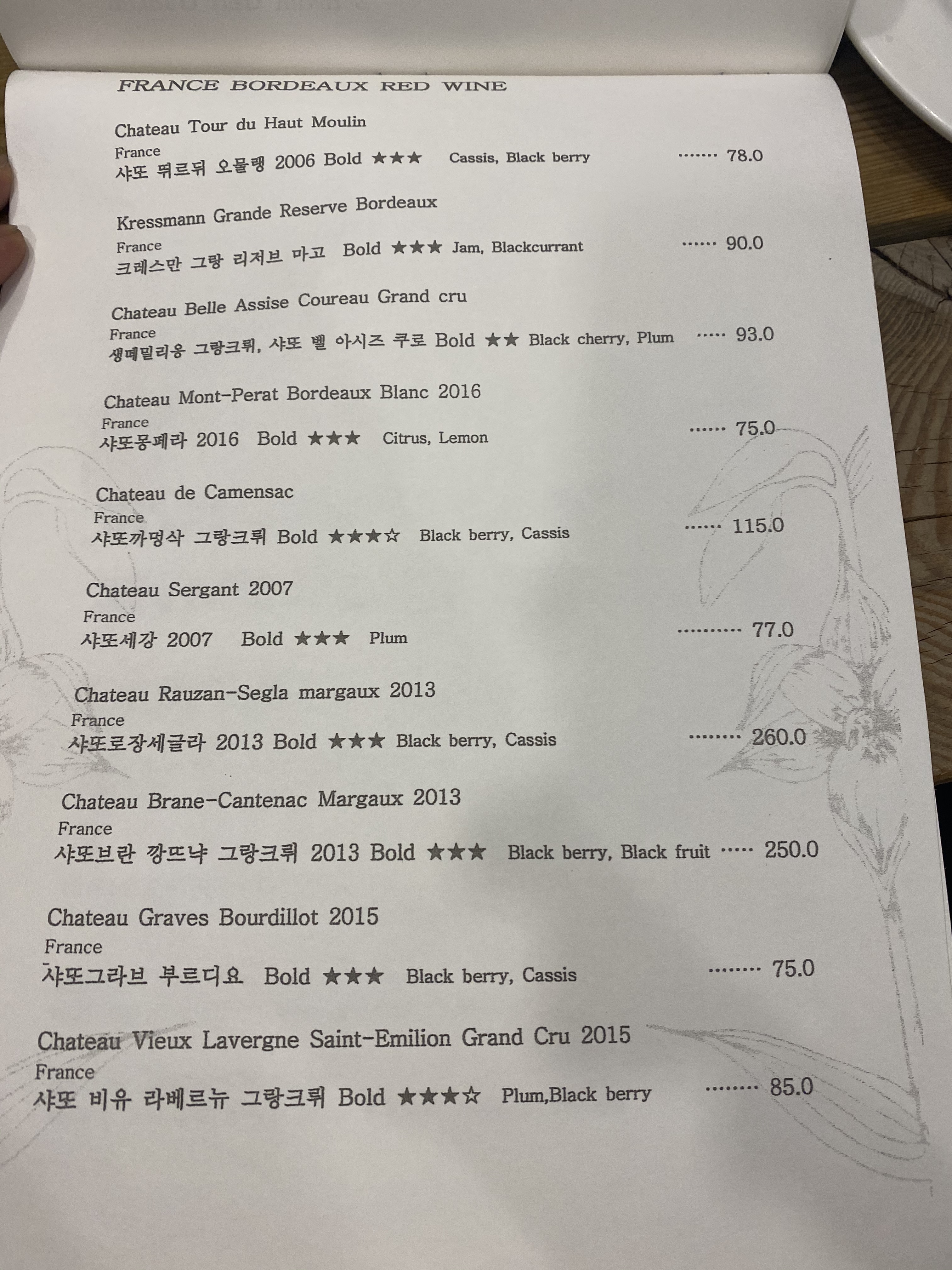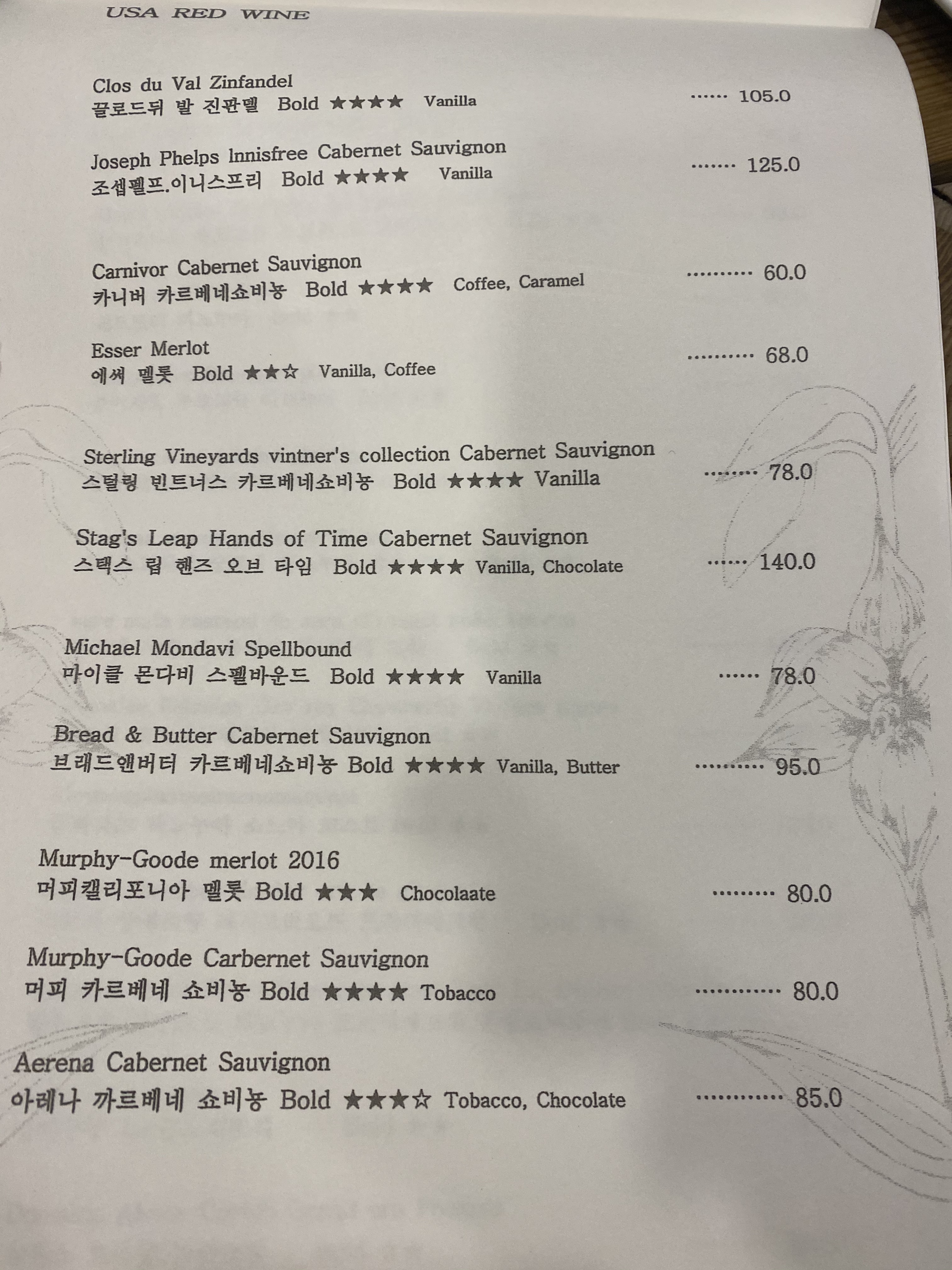 메인 메뉴에서부터 디저트 그리고 와인까지 가격이었습니다.