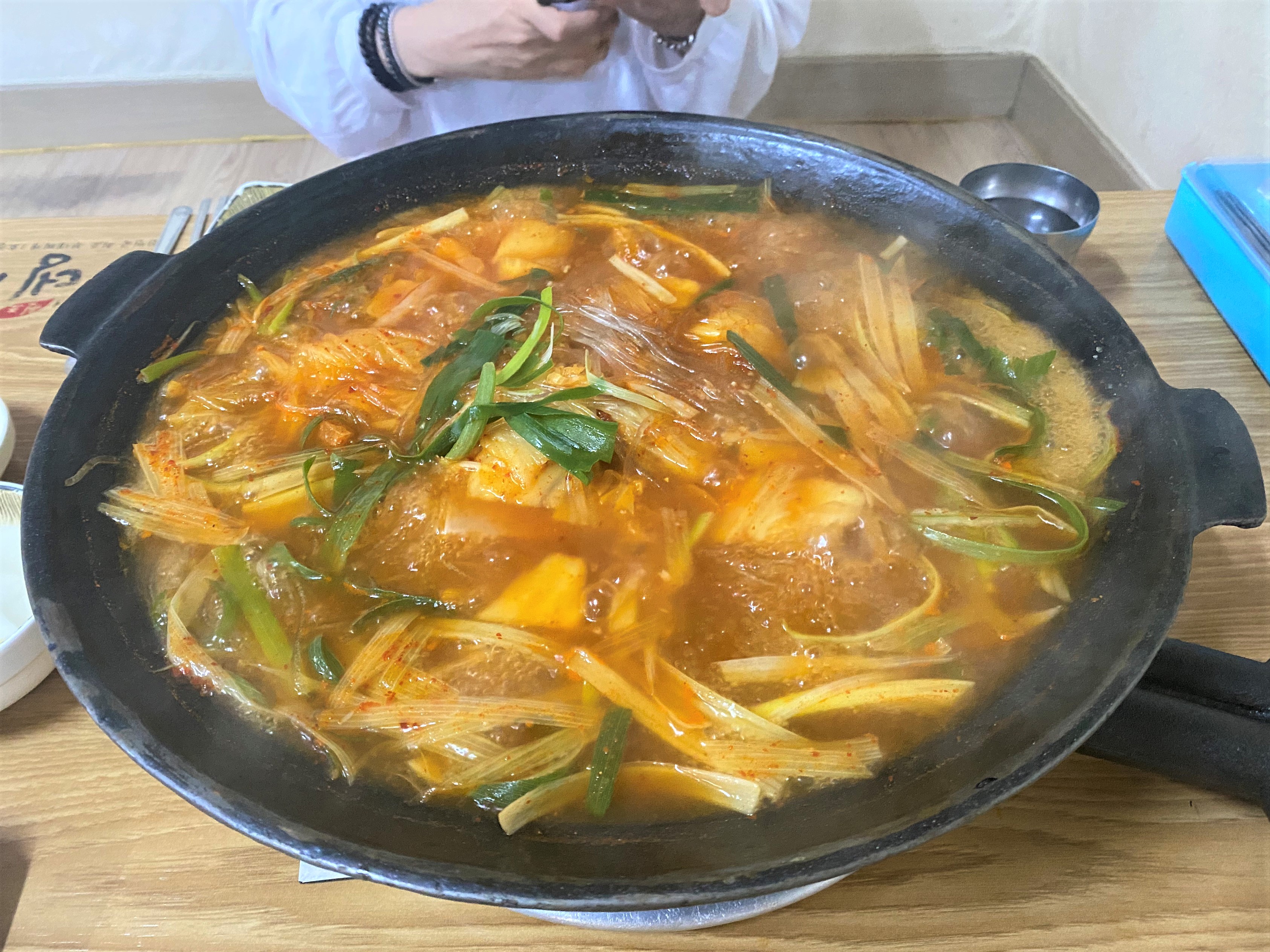 이렇게 육수 하고 재료를 담은 판이 나와요~ 당면이랑 파랑 많이 들어 있죠~