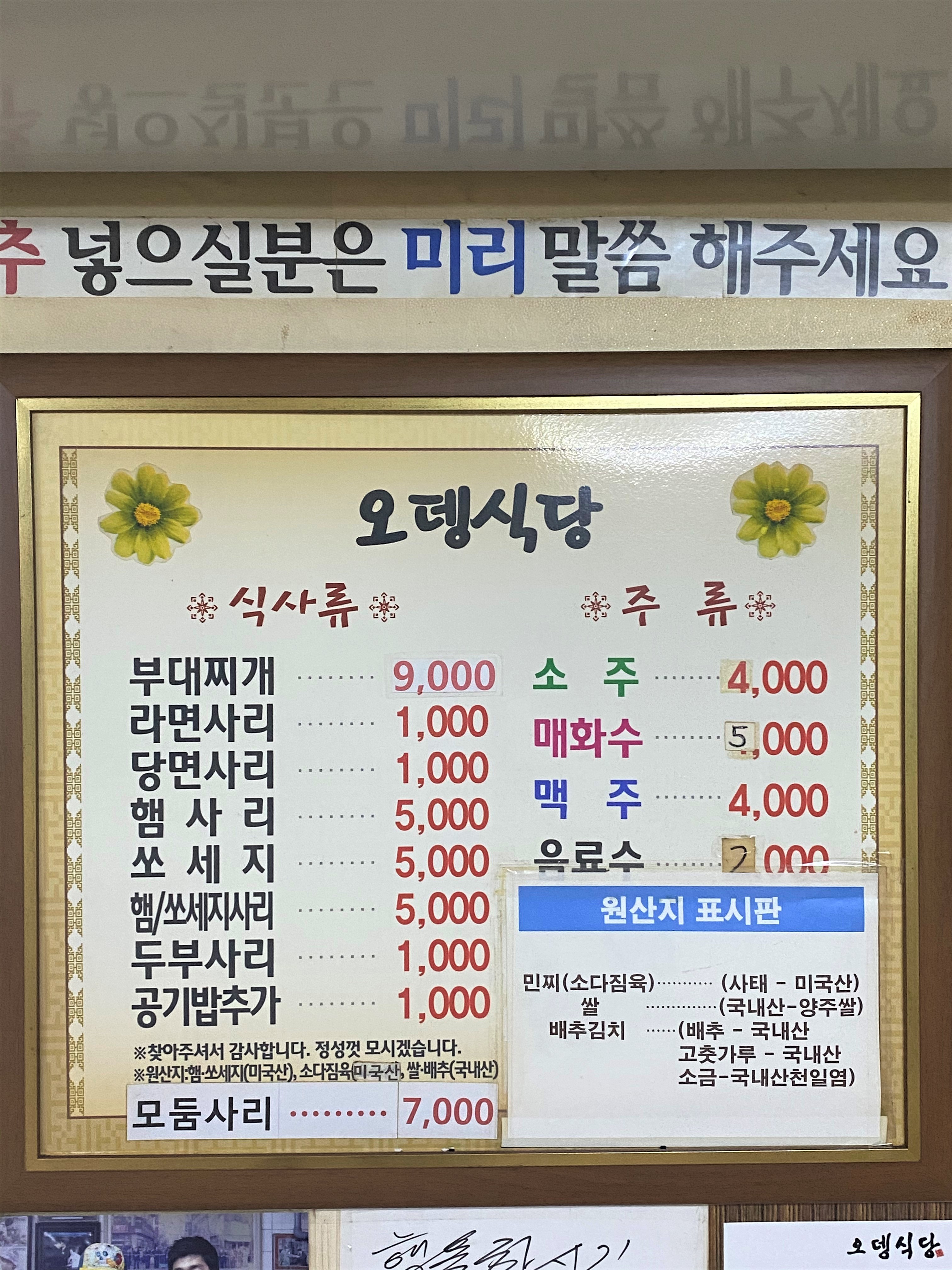 메뉴판입니다~ 기본적으로 부대찌개는 1인분 기준 9000원이네요