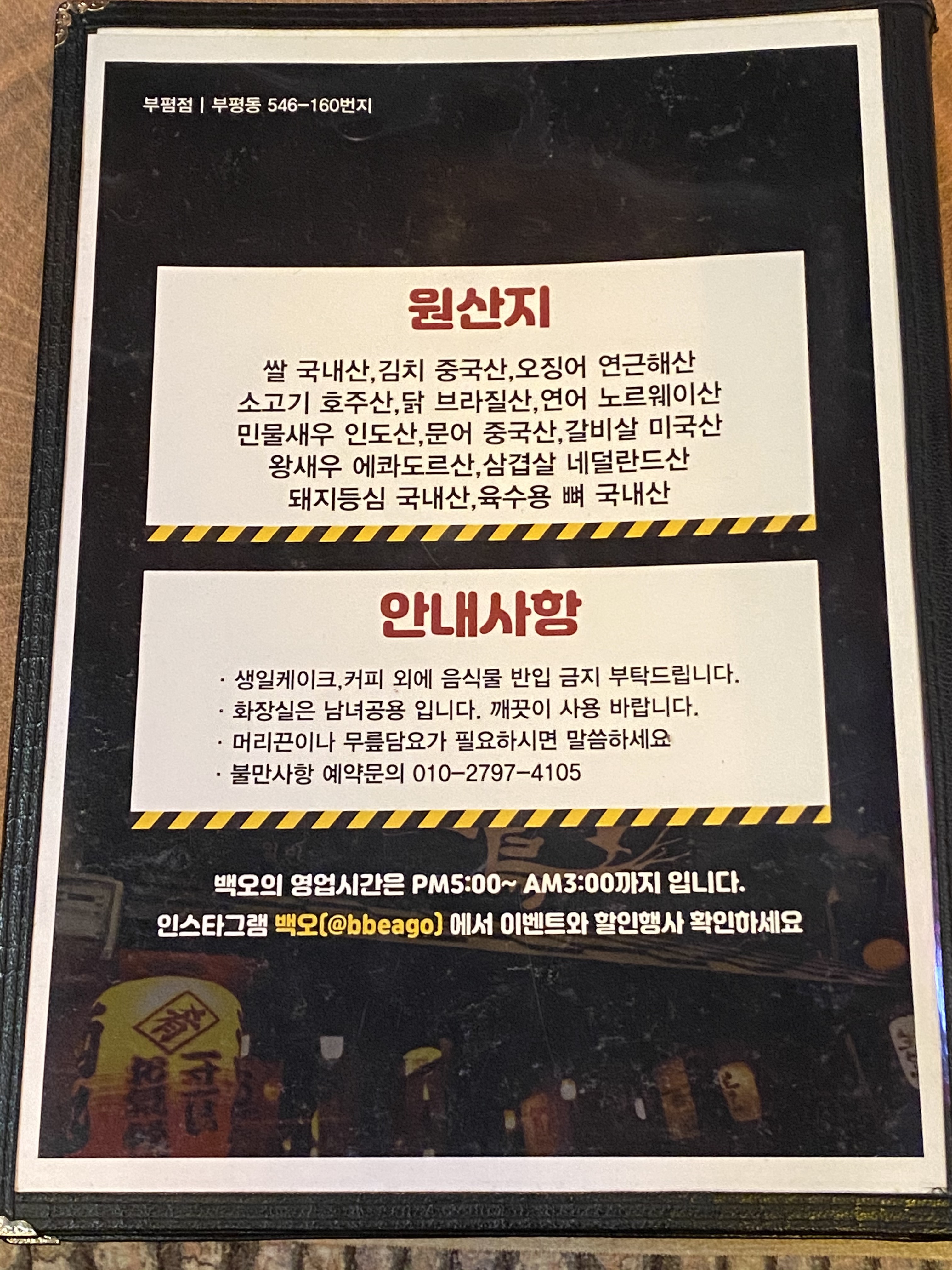 부평에서 상당히 유명한 곳이라고 하더라고요 사람도 엄청 많고요 거의 자리가 없어서 웨이팅 해야 하는 경우가 많은 그런 곳이라고 하더라고요 이름하야 백오 이자카야입니다.