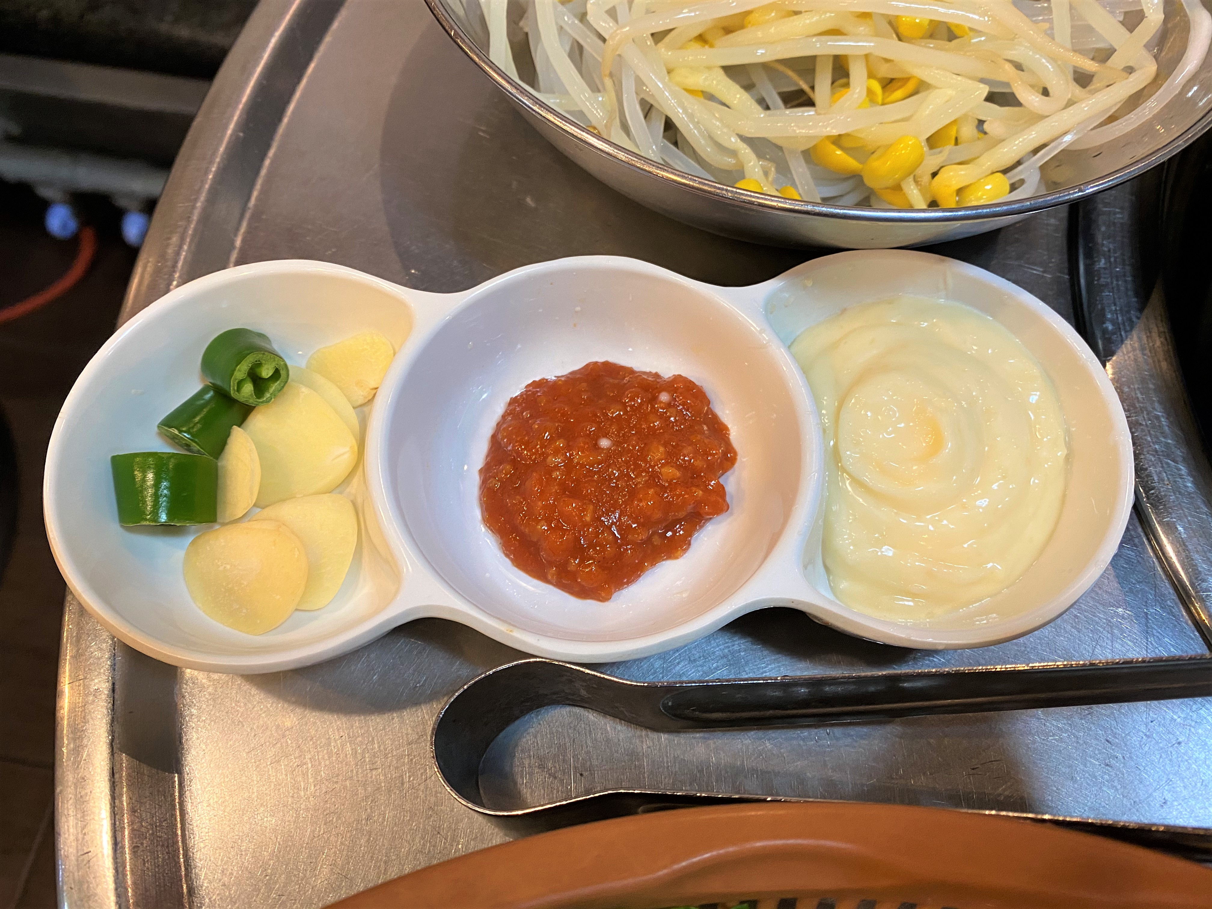 기본 찍어 먹는 장이고요~ 너무 맵다 싶으시면 저기 보이는 마요네즈 장에 찍어 드시면 더 부드럽고 고소한 맛으로 드실 수 있어요
