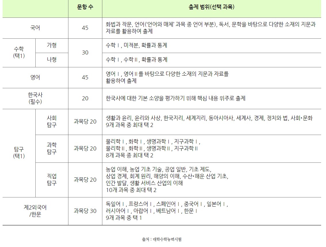 이번 12월에 진행될 수능시험 문항수와 출제 범위입니다.